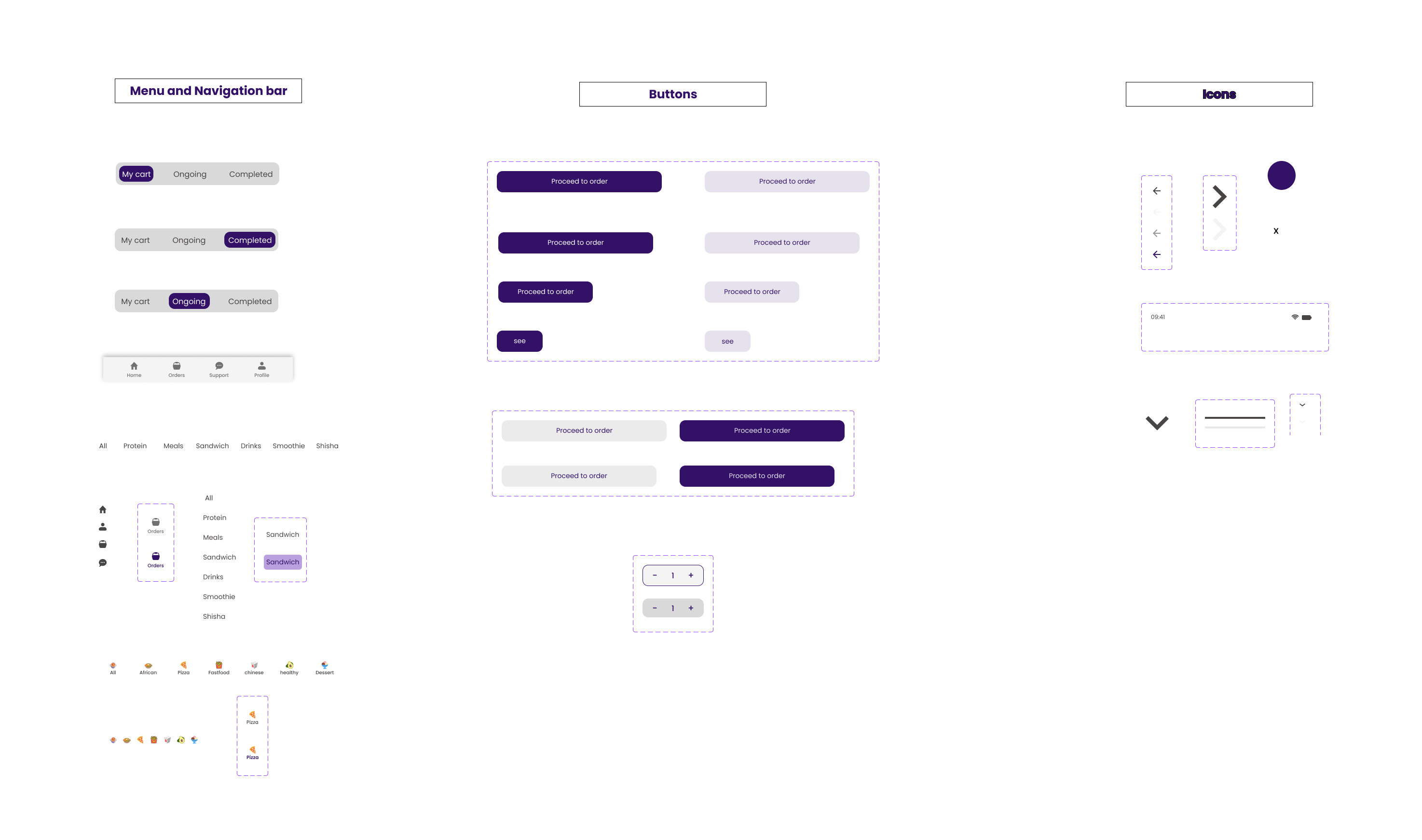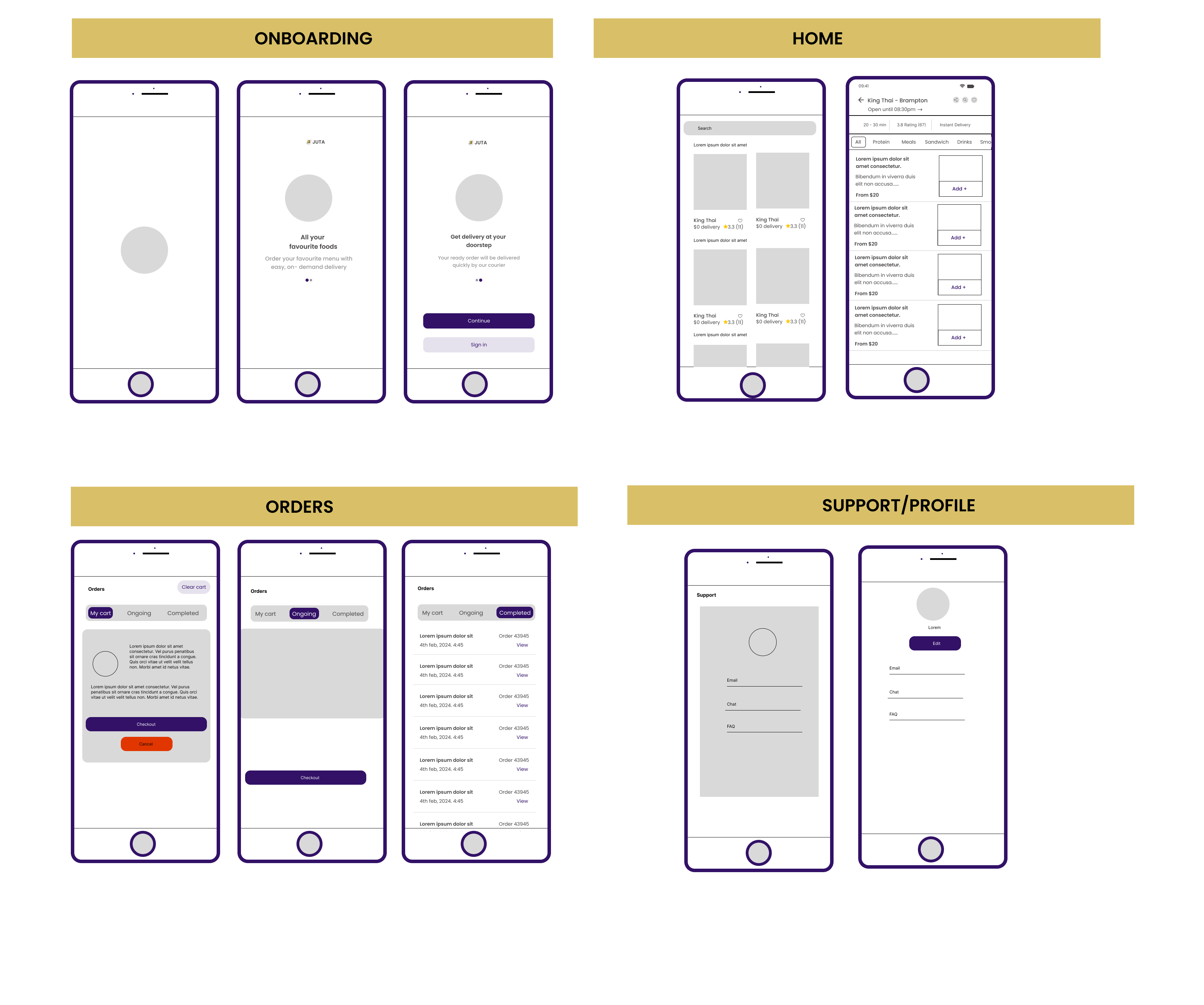 To visualize the structure and flow of the app, I created low-fidelity wireframes for the onboarding, home, and orders pages. These wireframes helped me map out the layout, prioritize key elements, and establish the user journey. By focusing on the core functionality and design hierarchy, I was able to refine the placement of components and ensure the app would deliver a seamless and intuitive user experience. I played around with a couple designs and came to this