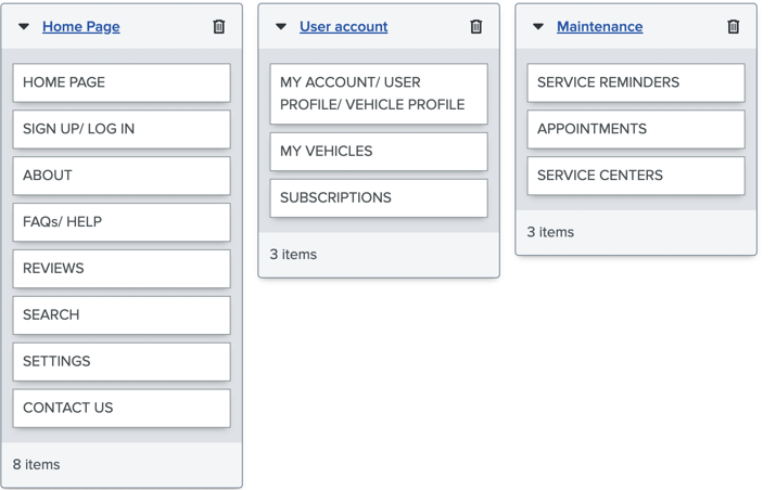 The information architecture (IA) was designed to provide users with a clear and intuitive navigation experience, ensuring they could easily locate services, manage their vehicle information, and complete tasks efficiently.